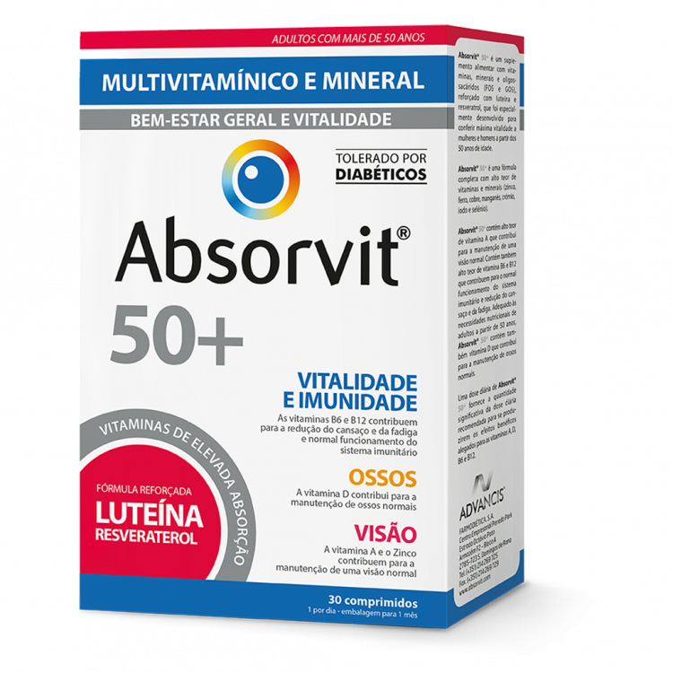 ABSORVIT® 50+ é um suplemento alimentar de toma única diária com vitaminas, minerais e prebióticos (FOS e GOS). Com teor aumentado de selénio, cujas necessidades aumentam com a idade, tem uma composição equilibrada, para conferir máxima vitalidade a partir dos 50 anos de idade.