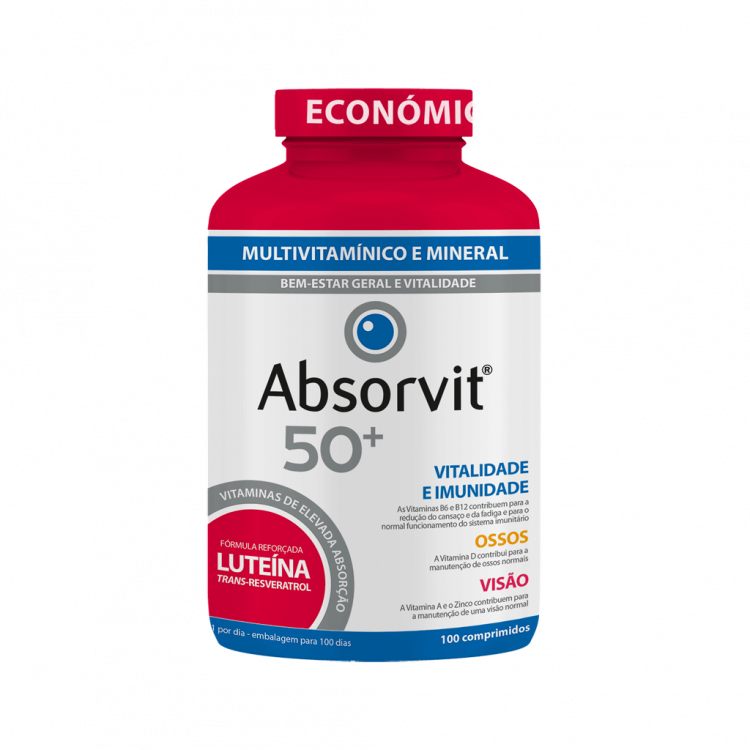 Contribui para a melhoria das defesas, proteção da visão e fortalecimento dos ossos. Absorvit 50+ é um suplemento alimentar de uma única toma diária com vitaminas, minerais e prebióticos. Com teor ajustado de cálcio e selénio, cujas necessidades aumentam com a idade, tem uma composição equilibrada para conferir máxima vitalidade a partir dos 50 anos de idade.Indicações: - Manutenção da visão e ossos saudáveis; - Estados de fadiga; - Reforço do sistema imunitário; - Carências nutricionais; - Programas de emagrecimento; - Períodos de convalescença e Polimedicados e toma de antibióticos.