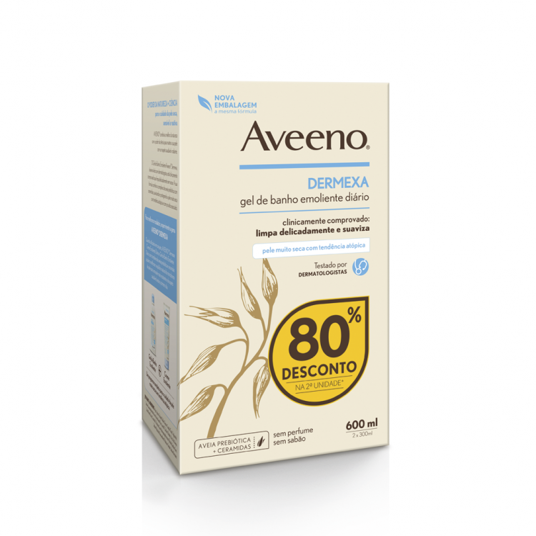 O Gel de Banho Emoliente Diário Dermexa, da Aveeno, limpa delicadamente, suaviza e protege a pele muito seca com tendência atópica e com prurido associado. Desenvolvido com dermatologistas. Está clinicamente comprovado que limpa delicadamente sem secar. A sua fórmula combina o complexo de Aveia Prebiótica com ceramidas. Sem perfume. Sem sabão. Pack composto por duas unidades, desconto de 80% na segunda unidade incluído no valor do produto.