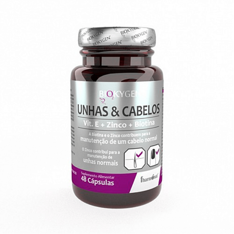 O Biokygen unhas e cabelo é um produto natural que tem como principio ativo a vitamina E, o Zinco e a Biotina.A Biotina e o Zinco contribuem para a manutenção de um cabelo normal.