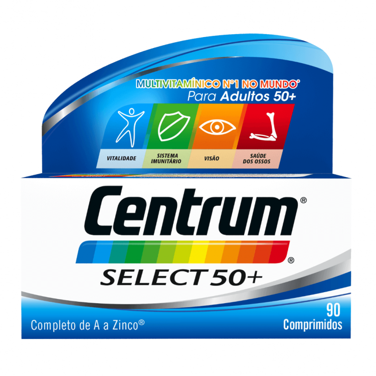 Centrum Select 50+ é um suplemento alimentar com vitaminas, minerais e luteína, numa fórmula especialmente equilibrada, que o ajuda a manter-se saudável. Com base nos mais recentes conhecimentos científicos, os teores de algumas vitaminas e minerais foram reajustados por forma a responder às necessidades nutricionais dos adultos com mais de 50 anos. A fórmula de Centrum Select 50+ proporciona benefícios de saúde, tais como: Vitalidade: Centrum Select 50+ contém vitaminas do complexo B que desempenham um papel indispensável na conversão metabólica das proteínas, lípidos e hidratos de carbono em energia. Também os minerais como o Cobre e o Manganésio, são essenciais para a transformação dos alimentos que ingerimos em energia Imunidade: Contém anti-oxidantes, importantes para o normal funcionamento do sistema imunitário Saúde Ocular: Inclui Luteína e vitamina A para a manutenção da saúde ocular Ossos Saudáveis: Com Cálcio e vitaminas D e K, para a manutenção de ossos fortes e saudáveis