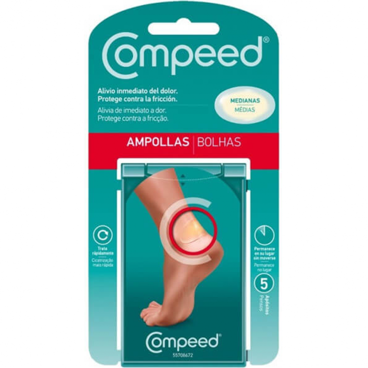 Compeed Bolhas Médias 5 Pensos, concebido com a finalidade de aliviar imediatamente a dor e ajudar a proteger contra a fricção adicional. Enquanto cria simultaneamente o ambiente ideal para ajudar a ferida a cicatrizar rapidamente.
