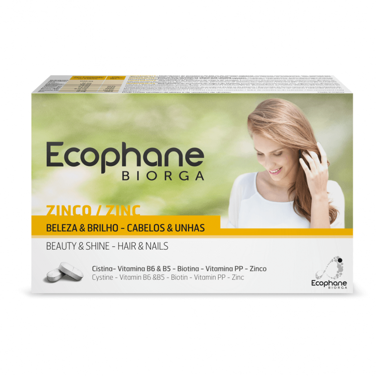 Verdadeira cura de beleza sazonal, os suplementos alimentares Ecophane Biorga devolvem o brilho aos seus cabelos e unhas. Os cabelos ficam mais fortes, mais suaves, macios e brilhantes As unhas ficam mais fortes, mais resistentes e brilhantes Podem ser aconselhados aos diabéticos, aos hipertensos, às pessoas que estão a seguir um regime hipocalórico (4 Kcal/comprimido), etc. Os comprimidos Ecophane Biorga são apresentados em caixas de 60 comprimidos, para um mês de tratamento. Para responderem melhor às suas necessidades, os suplementos alimentares Ecophane Biorga estão disponíveis em duas formas de apresentação: Comprimidos e Pó. Uma fórmula eficaz para uma ação reforçada: Os hidrolisados de proteínas de trigo e de sésamo são ricos em aminoácidos sulfúricos e intervêm na formação da queratina A vitamina B6 contribui para a síntese normal da cisteína A vitamina B8 e o zinco auxiliam na manutenção de cabelos e unhas normais O zinco ajuda a proteger contra o stress oxidativo (sol, poluição, fadiga…)