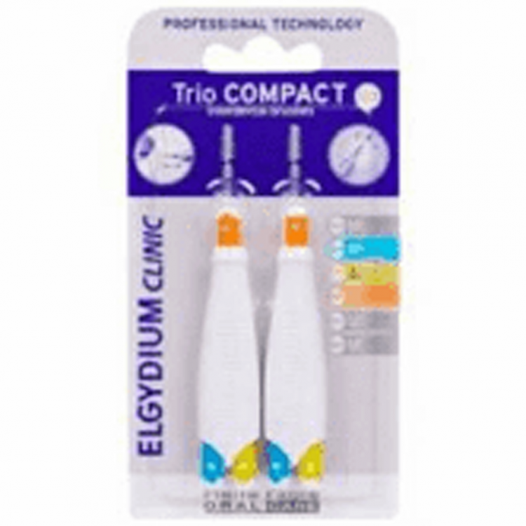 ELGYDIUM CLINIC ESCOVILHÃO TRIO COMPACT é o único sistema compacto e prático que combina três escovilhões num único cabo. Disponível em seis tamanhos diferentes. Cada tamanho tem uma cor correspondente, com diâmetro de arame específico (entre 0,38 e 0,80 mm) e diâmetro de cerdas específico (entre 1,9 e 8 mm) para se adaptar a todos os tamanhos dos espaços interdentários. Cinco versões disponíveis com uma escolha de escovilhões de um único tamanho ou mistos, com vários tamanhos.Têm ainda cerdas bicolores: brancas para revelar as gengivas sensíveis em caso de sangramento, e pretas, mais finas, para facilitar a inserção da escova e visualizar a eliminação da placa bacteriana.