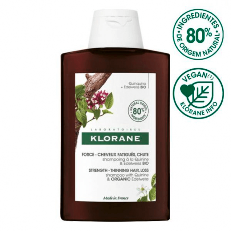 Klorane Capilar Champô com Quinina & Edelvaisse Bio devolve ao cabelo força. Graças à sua fórmula enriquecida em Vitaminas B, extrato de quinquina e Edelvaisse BIO, limpa o cabelo ao mesmo tempo que favorece o seu crescimento.Pode ser utilizado sozinho ou em complemento do cuidado antiqueda.Fórmula biodegradável de acordo com o teste OCDE 301B.Frasco 100% plástico reciclado.
