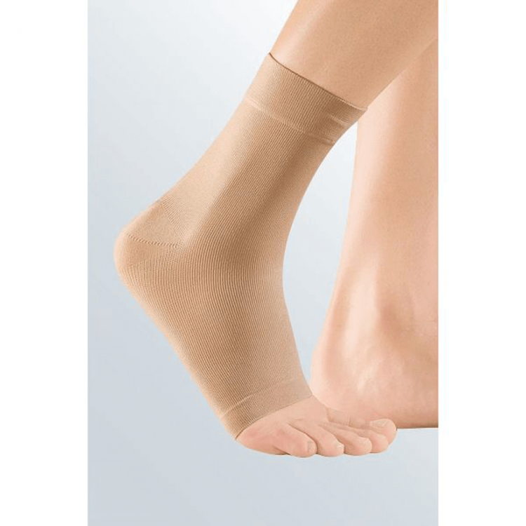 O pé elástico simples para o tornozelo não tem costuras e corresponde à classe de compressão II