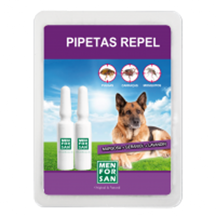 Pipetas repelentes para cães. Contém extracto de margosa, geraniol e óleo de lavandina para repelir insetos (pulgas, carraças e mosquitos). Permite uma alta proteção durante 30 dias. Não utilizar em cães com menos de 2 meses. Não aplicar em fêmeas durante o período de lactação.