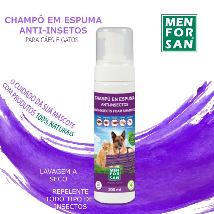 O champô em espuma anti-insetos para cães e gatos de Menforsan é um repelente natural de pulgas, carrapatos, mosquitos, ácaros e piolhos que não precisa de água para a sua aplicação.