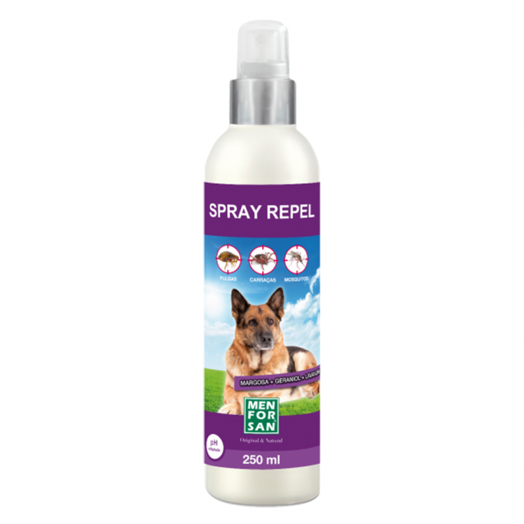 Spray repelente para cães contra pulgas, carracas e mosquitos. Contém Extracto de margosa, geraniol e Óleo de lavandina