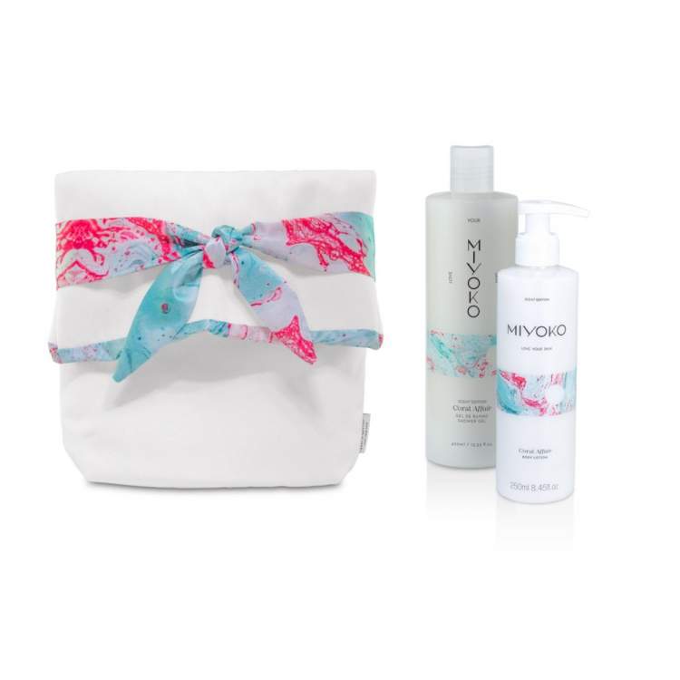 Miyoko Coffret Gel de Banho + Loção Corporal Coral Affair garante um cuidado de corpo diário ideal, deixando a pele limpa, cuidada e perfumada. O gel de banho, além de conferir uma excelente experiência sensorial graças ao seu aspeto perolado, contém extratos de camomila e lavanda e outros ativos, que ajudam a acalmar e hidratar a pele diariamente, ao mesmo tempo que a deixa limpa e agradavelmente perfumada. A loção corporal completa o cuidado que a pele necessita diariamente, com uma textura ligeira e de fácil absorção, mantém a pele hidratada e suave. Contém mais de 90% de ingredientes de origem natural, com perfume. Não contém parabenos. Oferta de um necessaire em algodão e cetim.