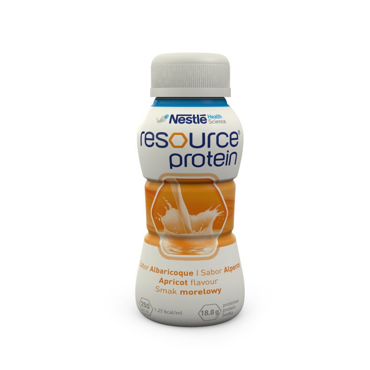 Resource Protein Alperce é uma dieta oral completa hiperproteica em formato 200ml, para indivíduos com necessidades proteicas aumentadas e/ou patologias que levam à desnutrição. Concentração calórica 1.25 kcal/ml, 18,8 g de proteínas por garrafa, Clinicamente isento de lactose, Isento de glúten e Contém todas as vitaminas, minerais e oligoelementos necessários para uma alimentação completa.