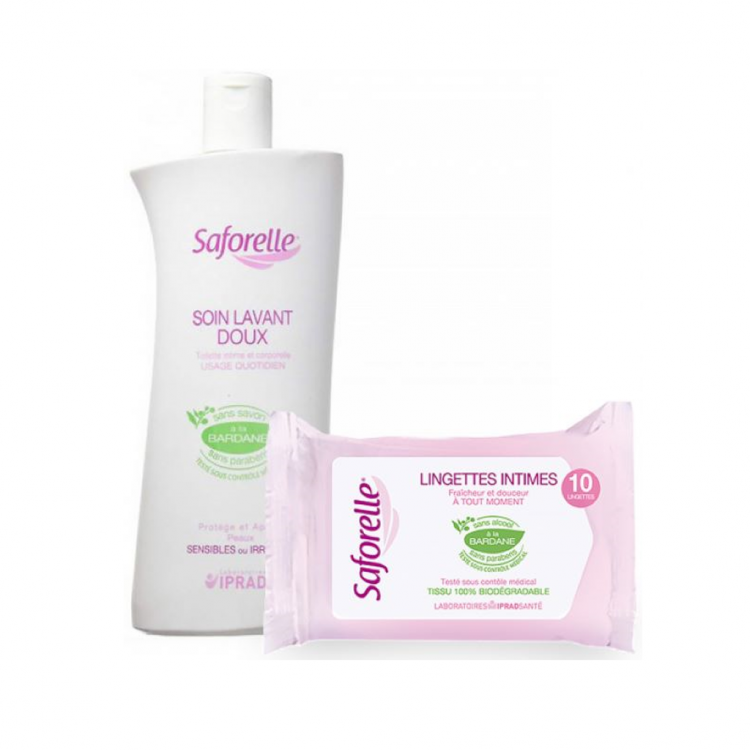 1) Saforelle Solução De Lavagem é uma solução para a higiene íntima diária, sem sabão, que limpa sem ação detergente, respeitando o equilíbrio natural da flora vaginal. Apresenta um pH ligeiramente alcalino (pH=8), o qual cria um ambiente que contribui para a diminuição do desenvolvimento de germes nocivos.Possui ação hidratante, antibacteriana, antifúngica e combate a comichão. Encontra-se especialmente indicada em qualquer condição de pele ou da mucosa em que a comichão se encontre presente, nomeadamente infeções fúngicas vaginais, mucosas sensíveis ou secas e varicela (aqui usado como gel de banho por possuir propriedades anticomichão). 2) Saforelle Toalhetes Toalhetes íntimos que limpam suavemente e refrescam, sempre que necessário (viagem, durante a menstruação, após atividade desportiva, antes de uma consulta médica, etc.). Enriquecidos com Bardana (Arctium lappa), planta conhecida pelas suas propriedades calmantes e suavizantes.Apresentam um pH ligeiramente alcalino, o qual cria um ambiente que contribui para a diminuição do desenvolvimento de germes nocivos. Fabricados num tecido natural de fibras 100% biodegradáveis, podendo ser descartados na canalização após utilização. Sem sabão, parabenos, álcool nem fenoxietanol. Testado sob controlo médico por ginecologistas.