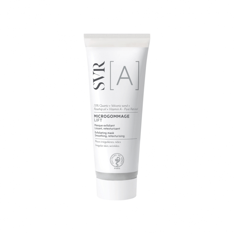 Para combater a acumulação de células mortas e os sinais de envelhecimento, o Laboratório SVR desenvolveu uma nova formula: Microgommage Lift enriquecido com vitamina A, uma máscara esfoliante 3 em 1 com 3 ações anti-envelhecimento.