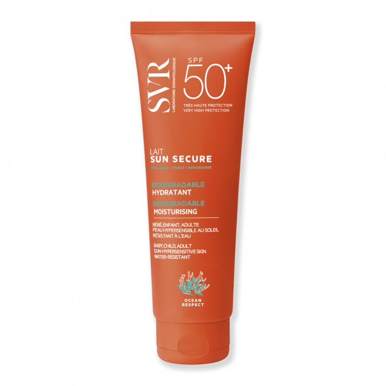 Leite hidratante biodegradável SPF50+, indicado para pele hipersensível ao sol. Bebés, crianças e adultos. Rosto e corpo. INOVAÇÃO SUN SECURE: PROTEÇÃO TRANSPARENTE.